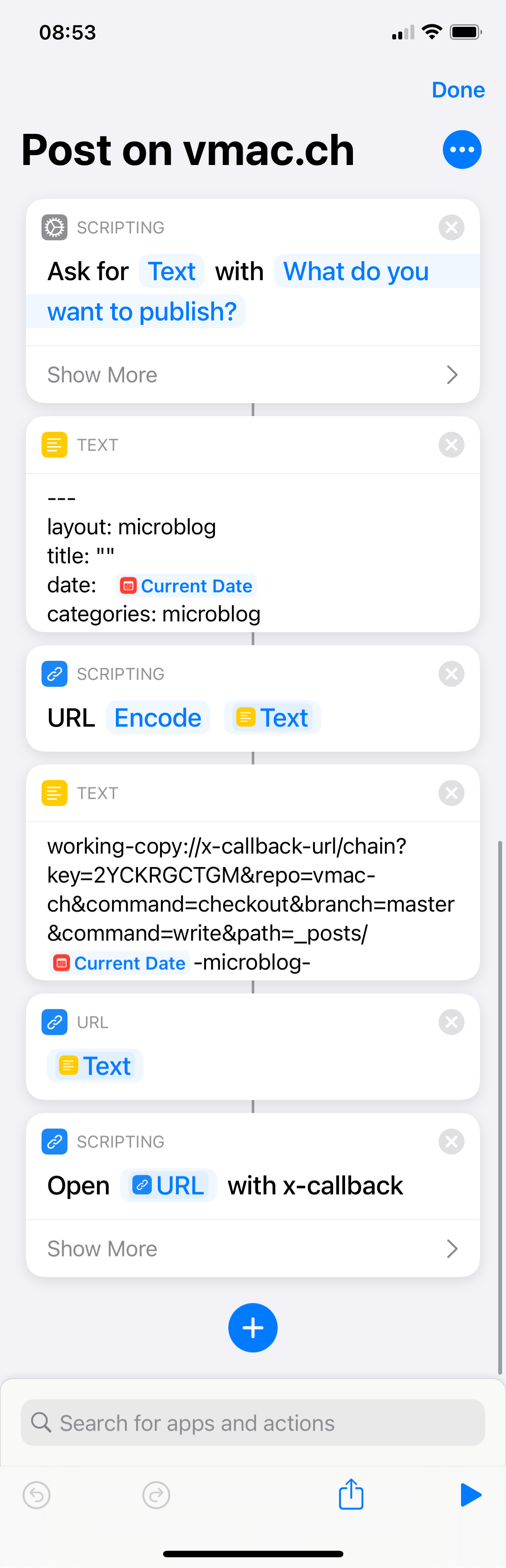 I’ve used a set of Shortcuts on my phone to post most of the short status updates. The shortcuts created new files directly in the git Repository with the help of Working Copy. The shortcuts were working quite well over time.